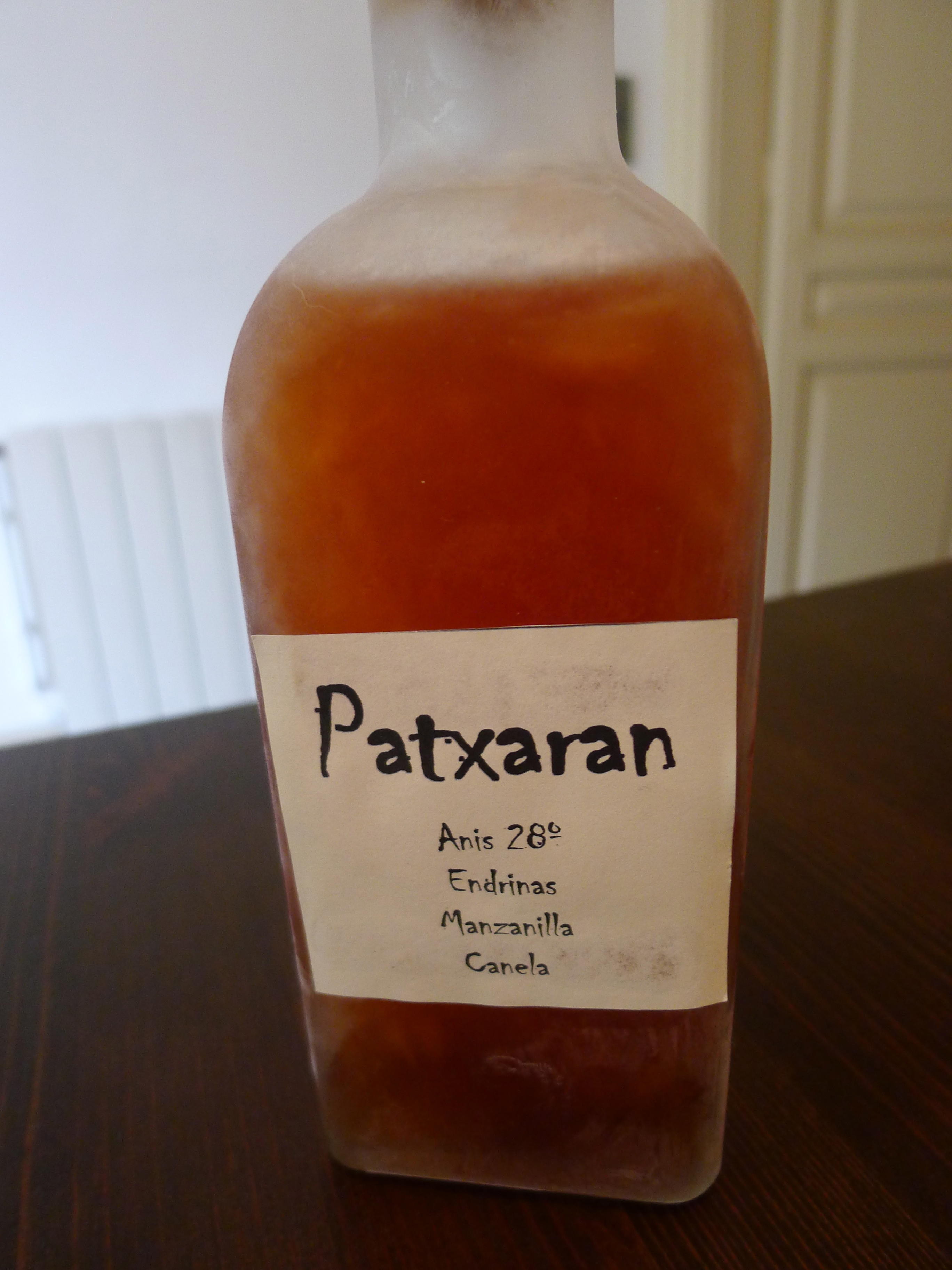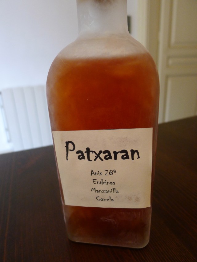 The “Patxaran” creation contains anise, chamomile, cinnamon, and something called “endrinas” which is a purple fruit from Basque Country that looks like a black grape. Interesting combination. Here’s a shot of the liquor (note to self – it freezes, so it might have been a bad idea to put in the freezer. We’ll see).