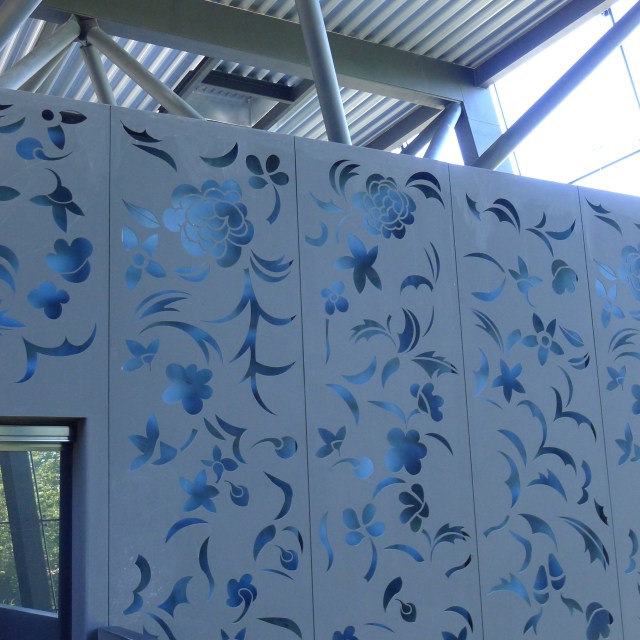 Behind the facade is a very post-modern building made of glass and metals. Here’s one shot from the 3rd floor, looking at a wall: