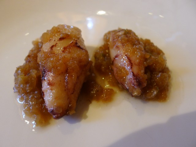 We started out with one bite of beautiful pink bonito (tuna) with a shallot vinaigrette that tasted much like a traditional mignonette for oysters: