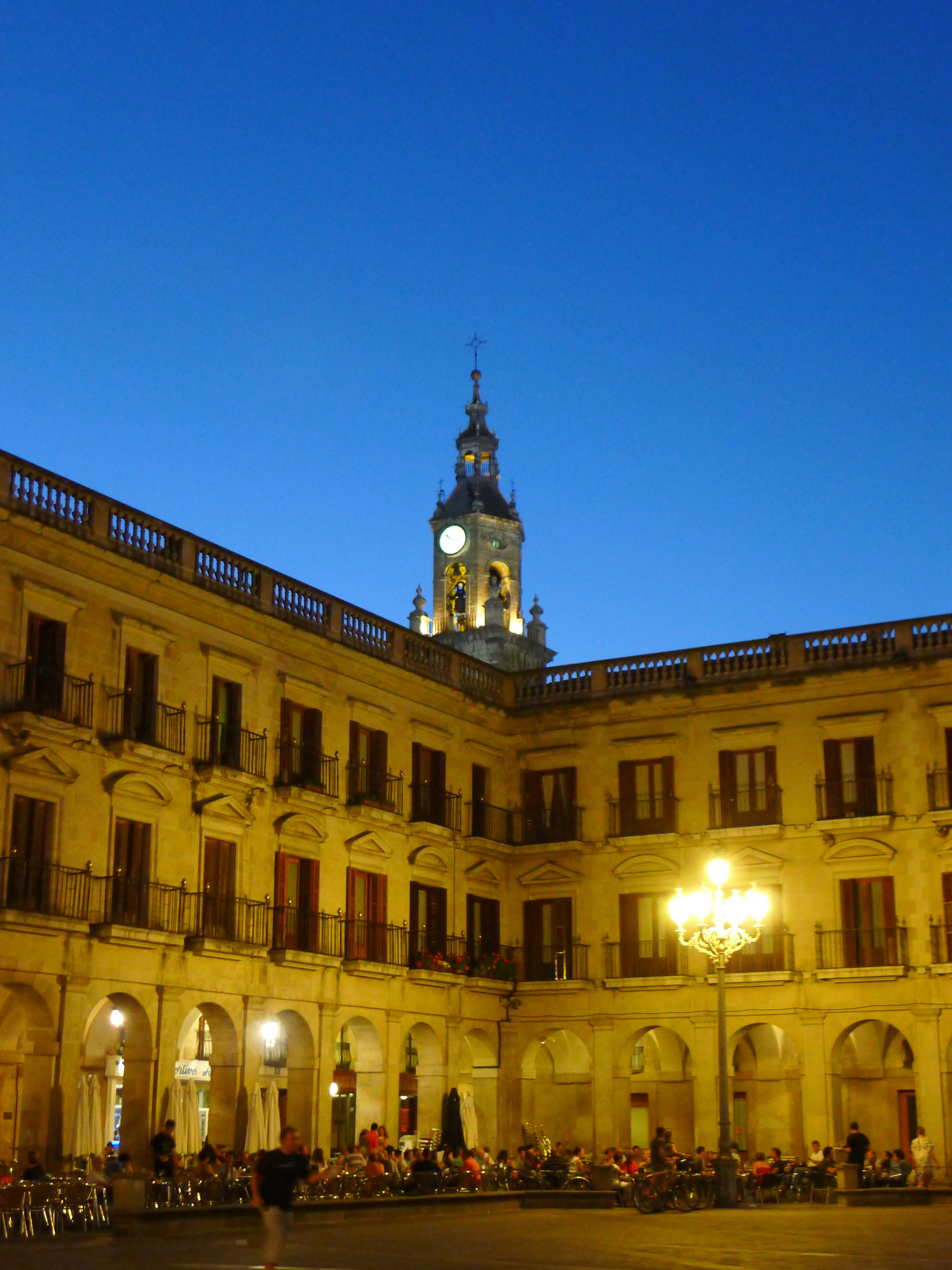 After some light walking through the town, we rolled up to some chairs on the boardwalk overlooking a long stretch of beach for some late afternoon coffee. We watched the sunset and then got back into the car and drove to Vitoria. Ana drove us right downtown for a night tour of the city. Vitoria is the capital of all of Basque country, so it’s a very clean, quaint, quiet town that is pretty sleepy Borja tells me, other than when the jazz festival is in town. Even then, it seemed VERY quiet to me. Below are some pics of Vitoria at night. It’s also known as the “green capital” of Europe. The streets were indeed very clean and there were recycling bins everywhere. Honolulu, take a lesson!