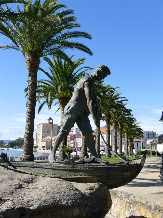 By the hightlighted picture at top, you can tell that Cambados is about the grapes…which means it’s about the wines, and more specifically Albariño. It’s also about the mariscos (shellfish). So, when you step off the bus, you are greeted by this lovely fisherman about 100 yards to your left, in a darling park (Paseo Da Calazada) full of palm trees that line the water promenade (Paseo Maritmo).
