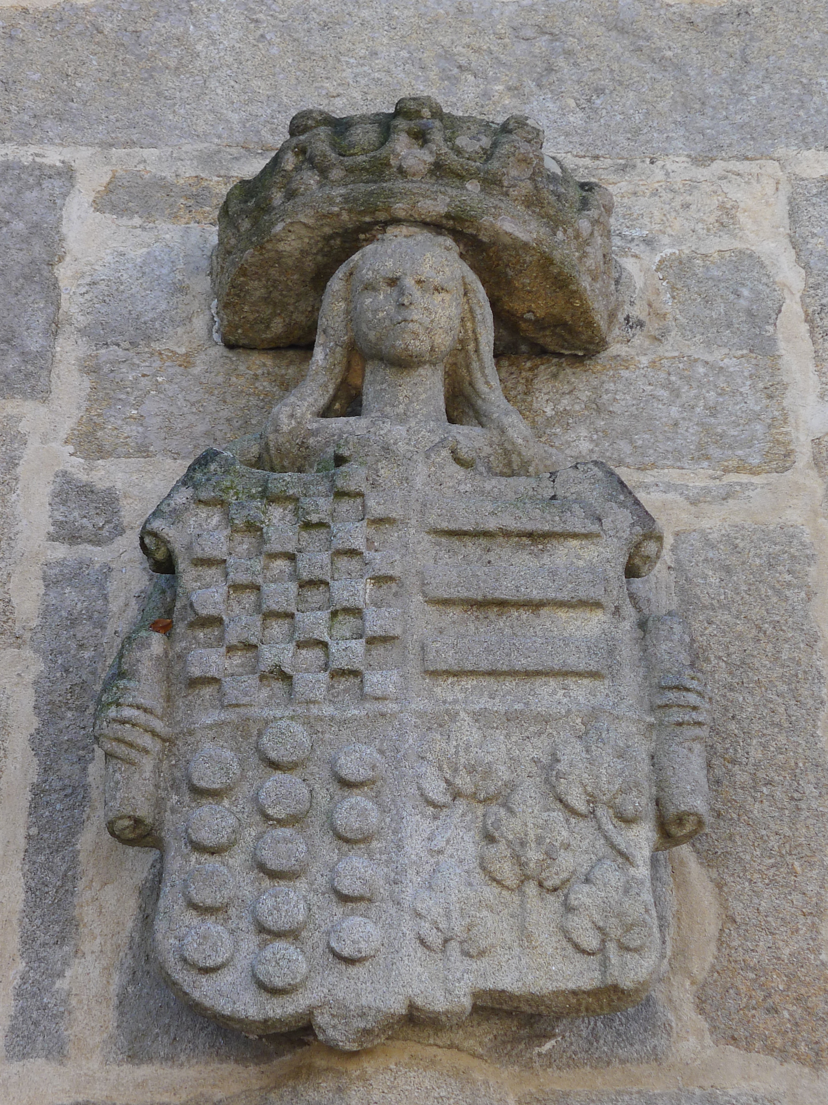 On the side of a building in the courtyard, here’s a woman holding her family crest: