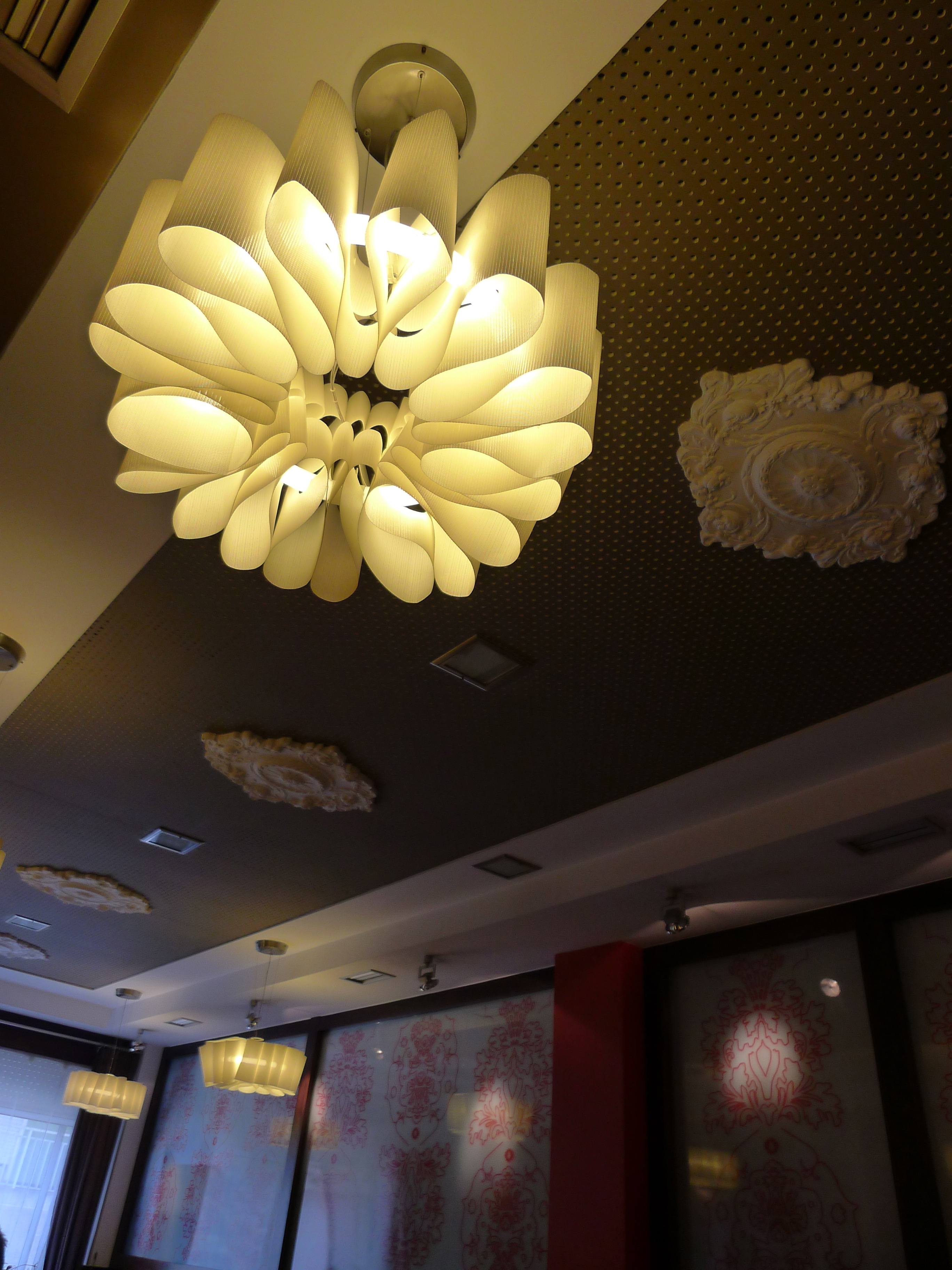 As I walked through the outskirts of town toward the main square called Praza de Fefiñans, I came upon a promising looking restaurant – Obopaladar. It was a disappointment. I had a piece of tuna that was perfectly seared, but the chef must have been having a bad day, as it was WAY over-salted and someone apparently dropped the salt shaker in the ratatouille my bonita was sitting on, as well. Gross. Umm, didn’t the description on the menu highlight asparagus? Why is there only 1 spear cut in half on the plate? The only thing good about the restaurant was the cool, very modern light fixtures and the ceiling. Here’s a pic:
