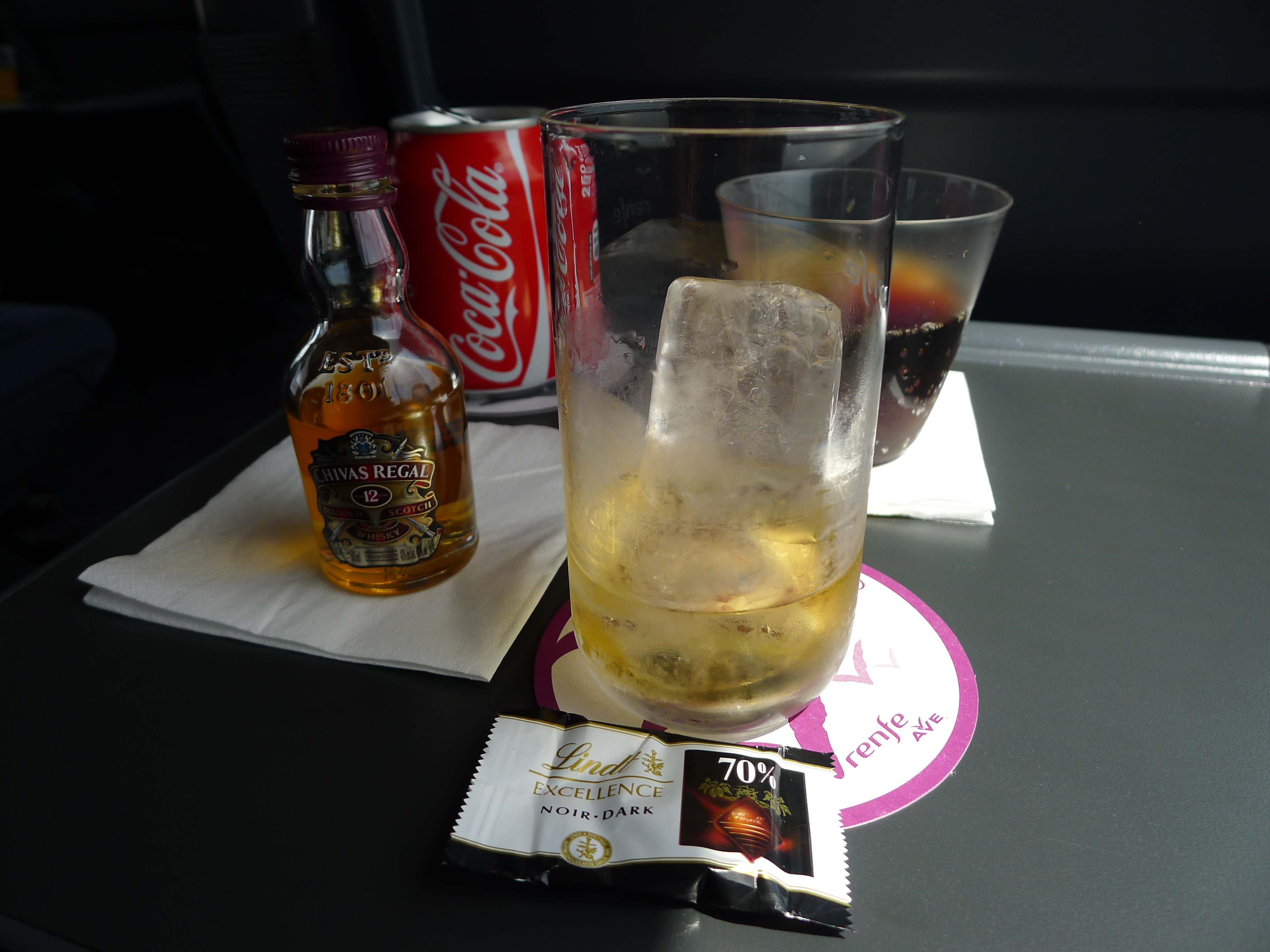 (As I’m writing this I’m looking at my notes I took throughout the day at O Grove. I’m in the first class cabin of the Renfe train from Madrid to Barcelona. I decided to pass on the “free” airplane looking food. But, in honor of my husband, I’m drinking coke and whiskey. Oh, and eating dark chocolate. That’s a lunch of champions, right? See pic below.)
