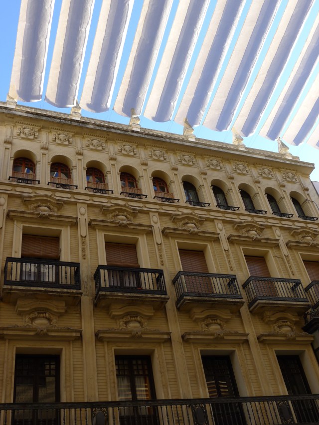 One of the things I loved about Córdoba was that some of the pedestrian walkways were covered with white banners of sorts to block out the sun. Córdoba was very hot when I arrived, like around 98 degrees F/36-37 degrees celsius. So, this was a fabulous idea. Here’s a pic of the banners overhead from one of the pedestrian streets: