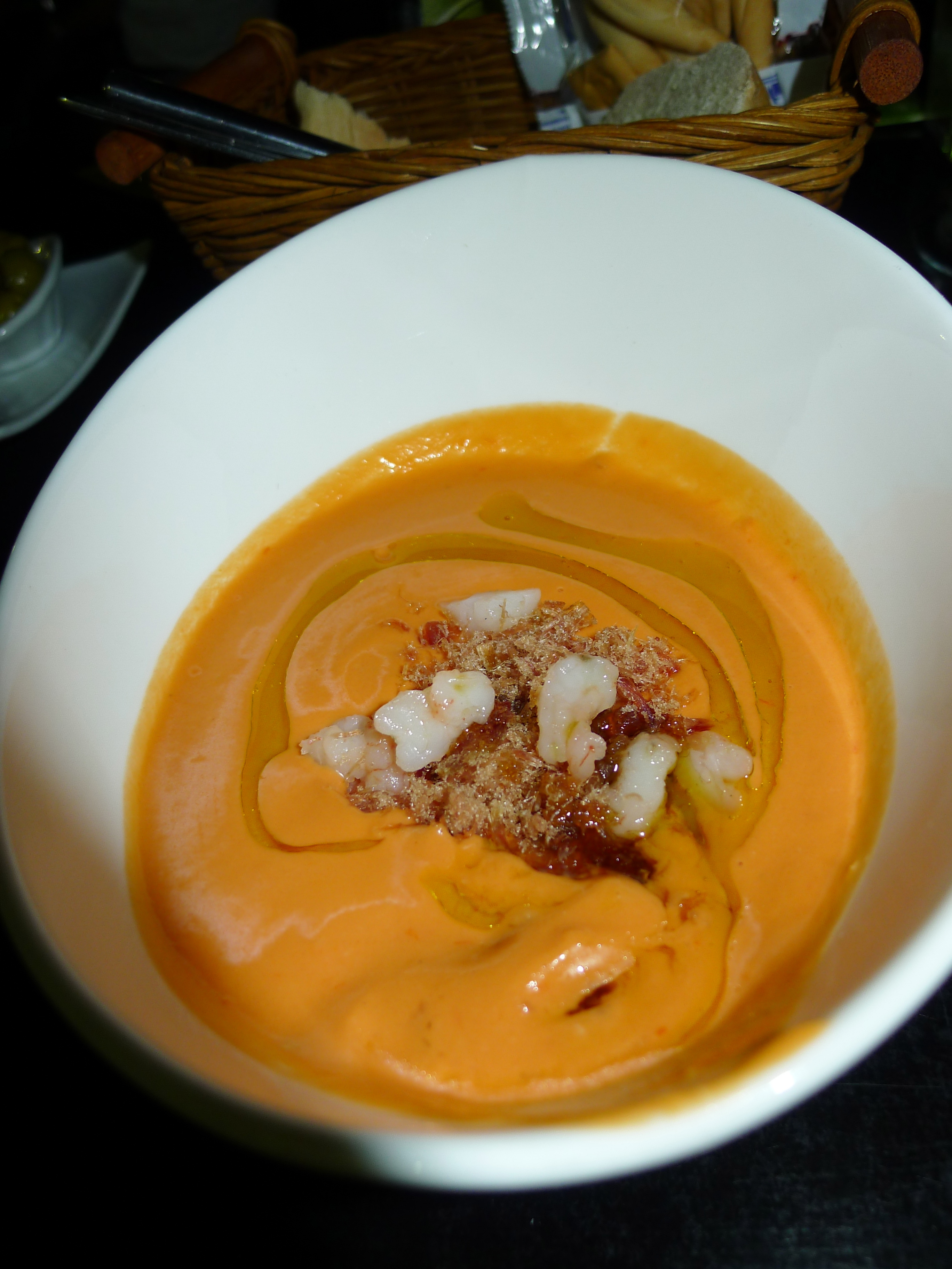 The base of this dish was the traditional creamy tomato gazpacho, but then it was topped with shaved, smoked tuna and a fresh prawn. All that was drizzled with a spicy olive oil. This is a killer dish on a hot day. I loved it! Here’s a pic: