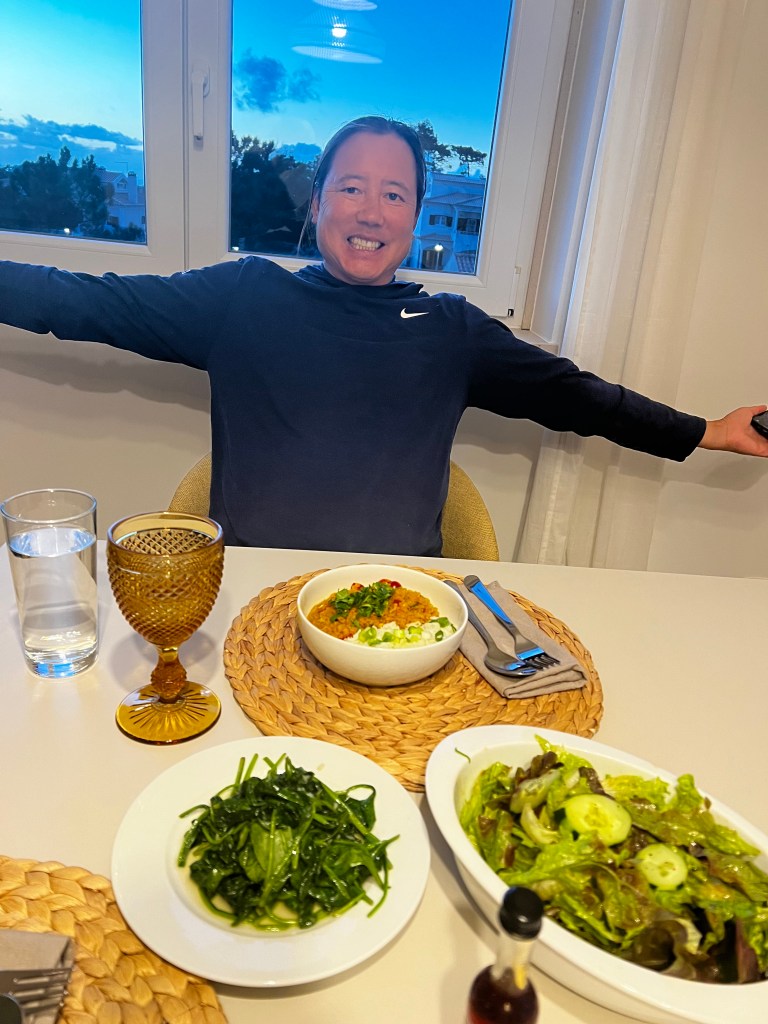 Finally, tonight a vegan dinner of red lentils, sautéed spinach in garlic and a salad to help balance the ridiculous amount of rich eating and drinking we’ve been doing.