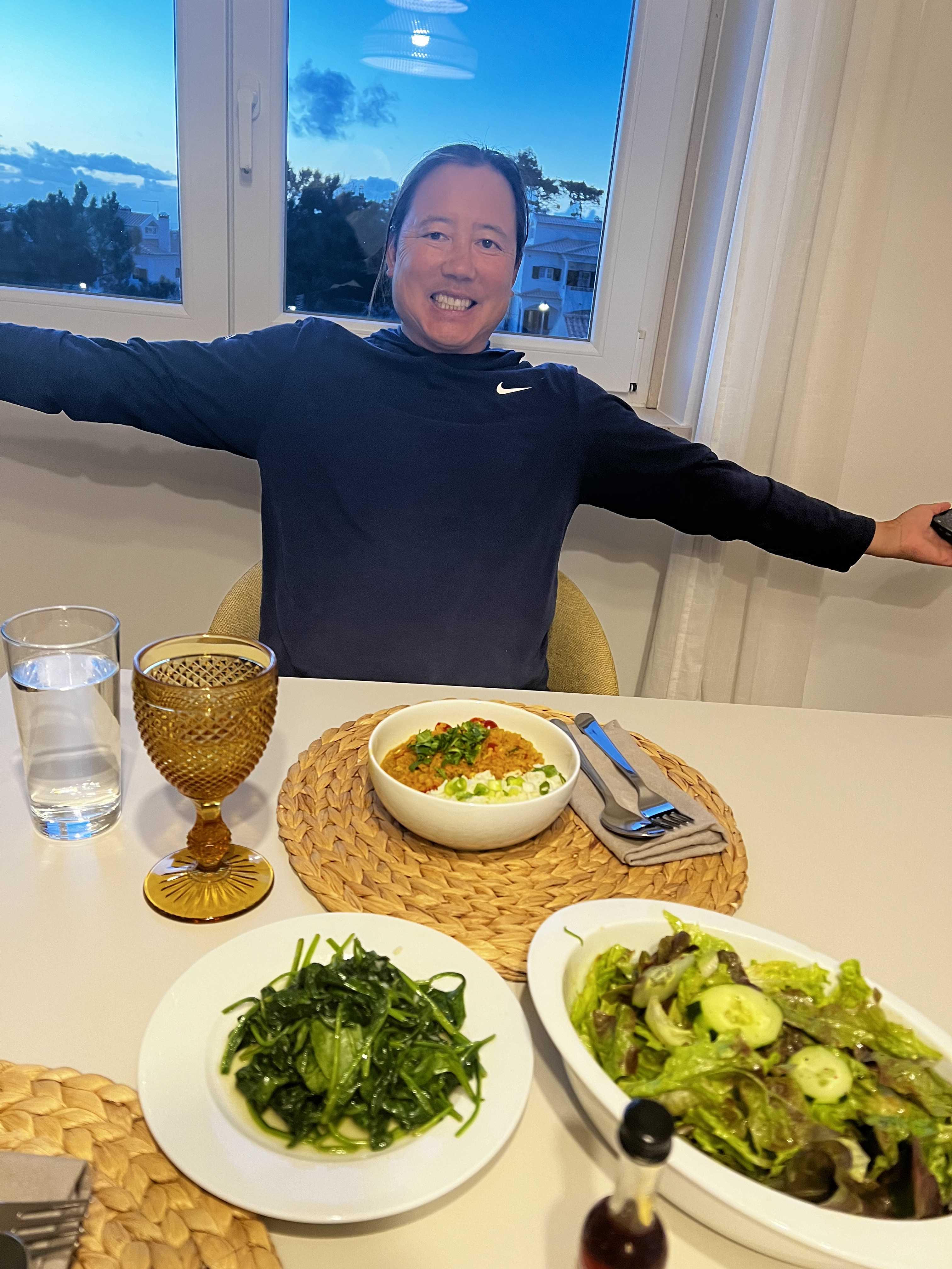 Finally, tonight a vegan dinner of red lentils, sautéed spinach in garlic and a salad to help balance the ridiculous amount of rich eating and drinking we’ve been doing.