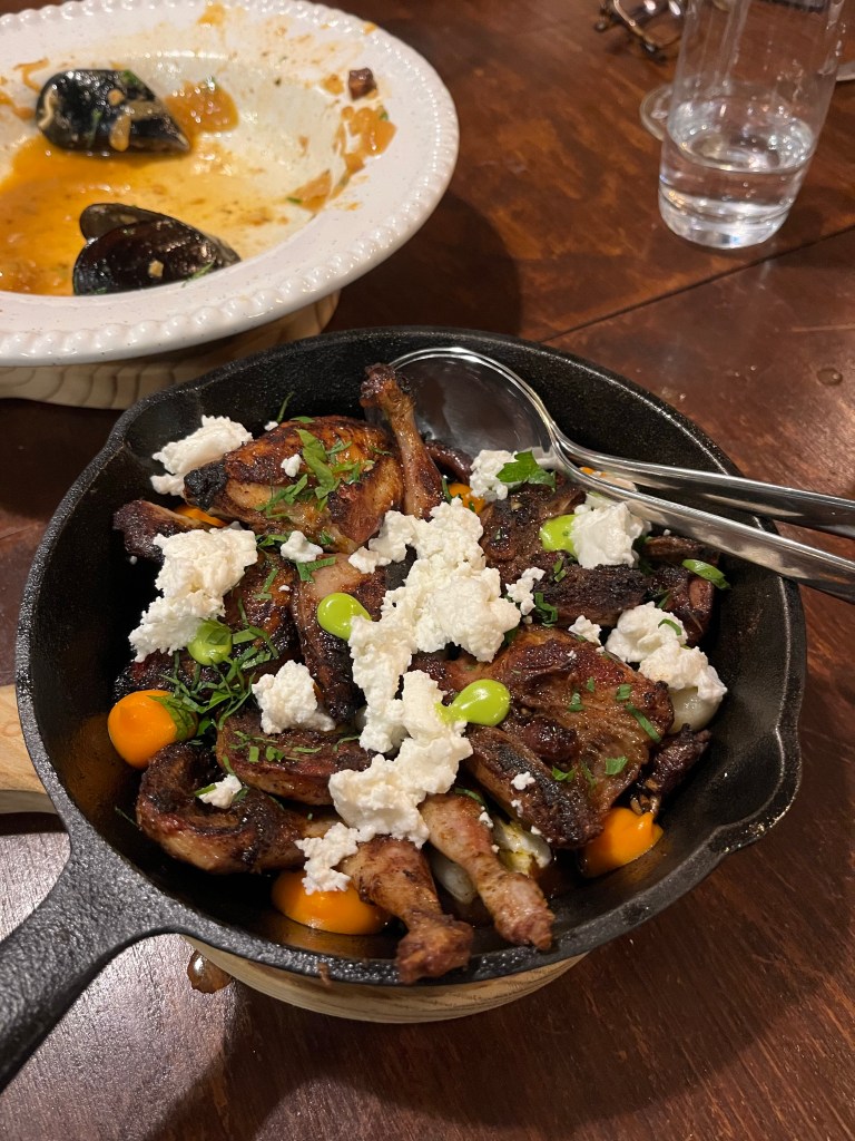 We started with a wild boar croqueta which had a dollop of a lively green sauce on top and a stewed applesauce on the bottom of each one to hold them onto the plate (smart). The mussels were delectable but the star was the quail. The white fish with clams was another knock out. We keep trying cod wherever we go because they love their cod in Portugal. I haven’t had a bite that speaks to me yet. But, I’m going to keep trying.